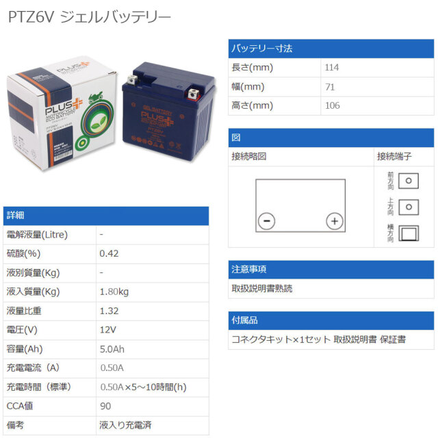 ■GSユアサバッテリー:YTZ6V/GTZ6V/YTX5L-BS ■古河バッテリー:FTZ6V/FTX5L-BS |
