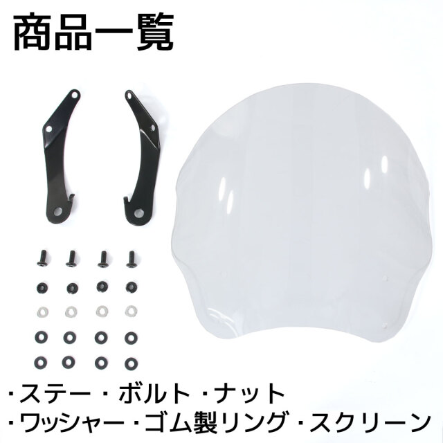 ■風よけ、虫よけ、雨や石から守るメーターバイザーです。 ■湾曲している形状は、範囲が広くウィンドプロテクションがアップします。 ■防風性が上がるので、体に当たる走行風や虫、小石を防ぎ防寒効果もアップするので、ロングツーリングにもおすすめです。 ■車両のイメージを大切にし、スクリーンだけが悪目立ちしないよう車体に馴染むデザインとなっております。 ■クリアタイプとなりますので、視界の妨げにもなりません。 ■ステーにはスチール材を使用しており、強度が大きいので長期間使用する事が出来ます。 ■丸目1灯のネイキッド車両であれば様々な車両にご利用いただけます。 |