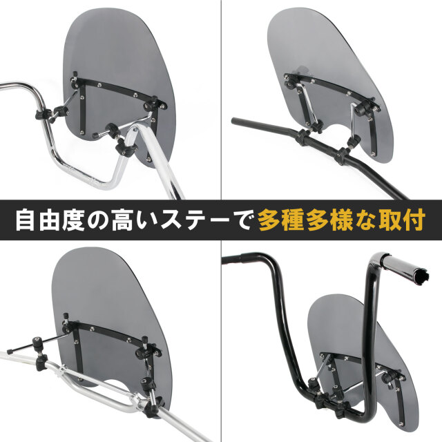 ■運転時の風を受け流す事に特化したスクリーンです。 ■自由度の高いステーで様々な形のハンドルやスイッチの位置などに合わせてお取り付けができます。 ■しっかりと風を防ぎますので、通勤やロングツーリング時の体温低下や疲労軽減にも効果を発揮します。 ■スクリーンに掛かる風圧が大きくなる為、スクリーン自体にも金具を取り付けて補強してありますので見た目のアクセントだけでなく耐久性にも問題なくご使用いただけます。 ■様々な車両にお取り付け可能ですが、大型のスクリーンですので、クルーザーや大型車両に特にマッチします。 ■ハンドルにクランプする部分に樹脂製パーツを採用し、お取り付けの際にハンドルにキズがつきにくくなっています。 ■出荷前には、撥水効果・防汚効果の高いコーティング施工を行っております。 |