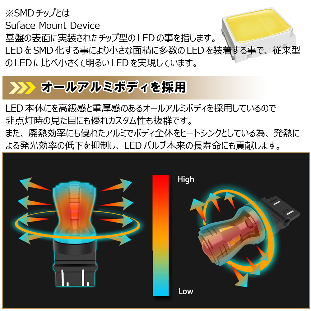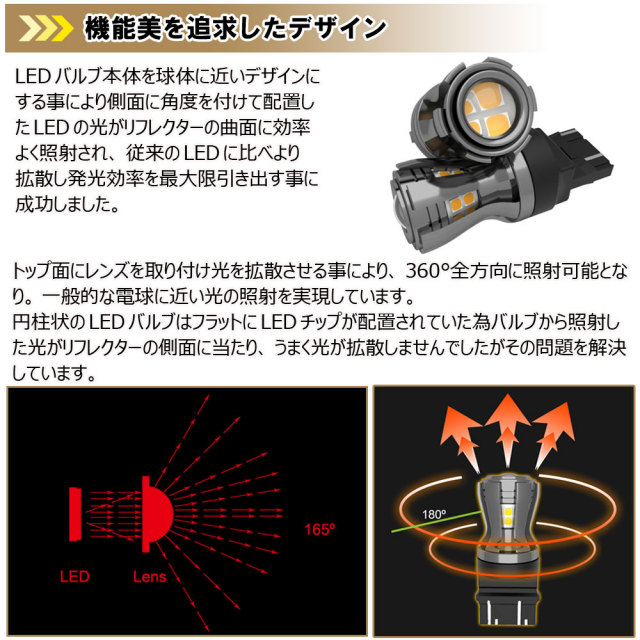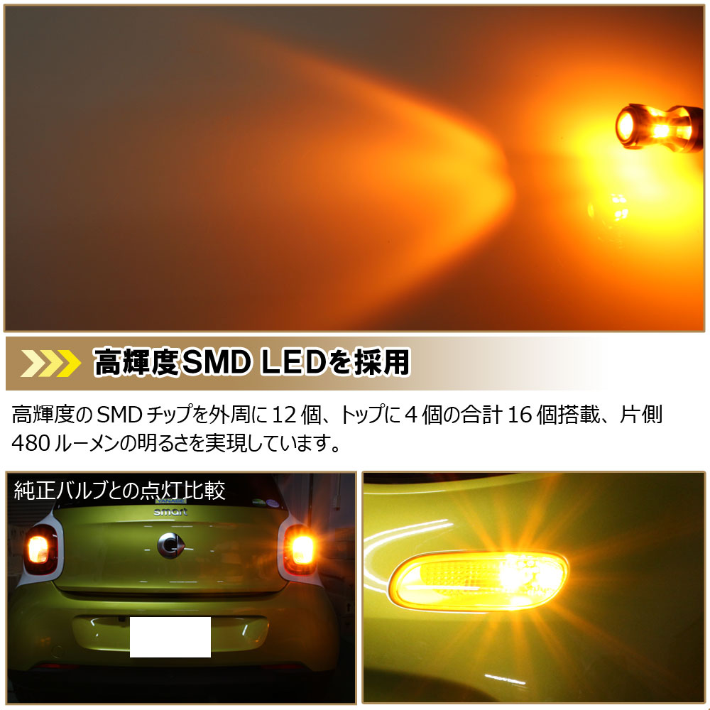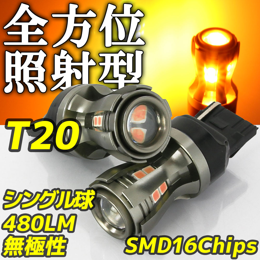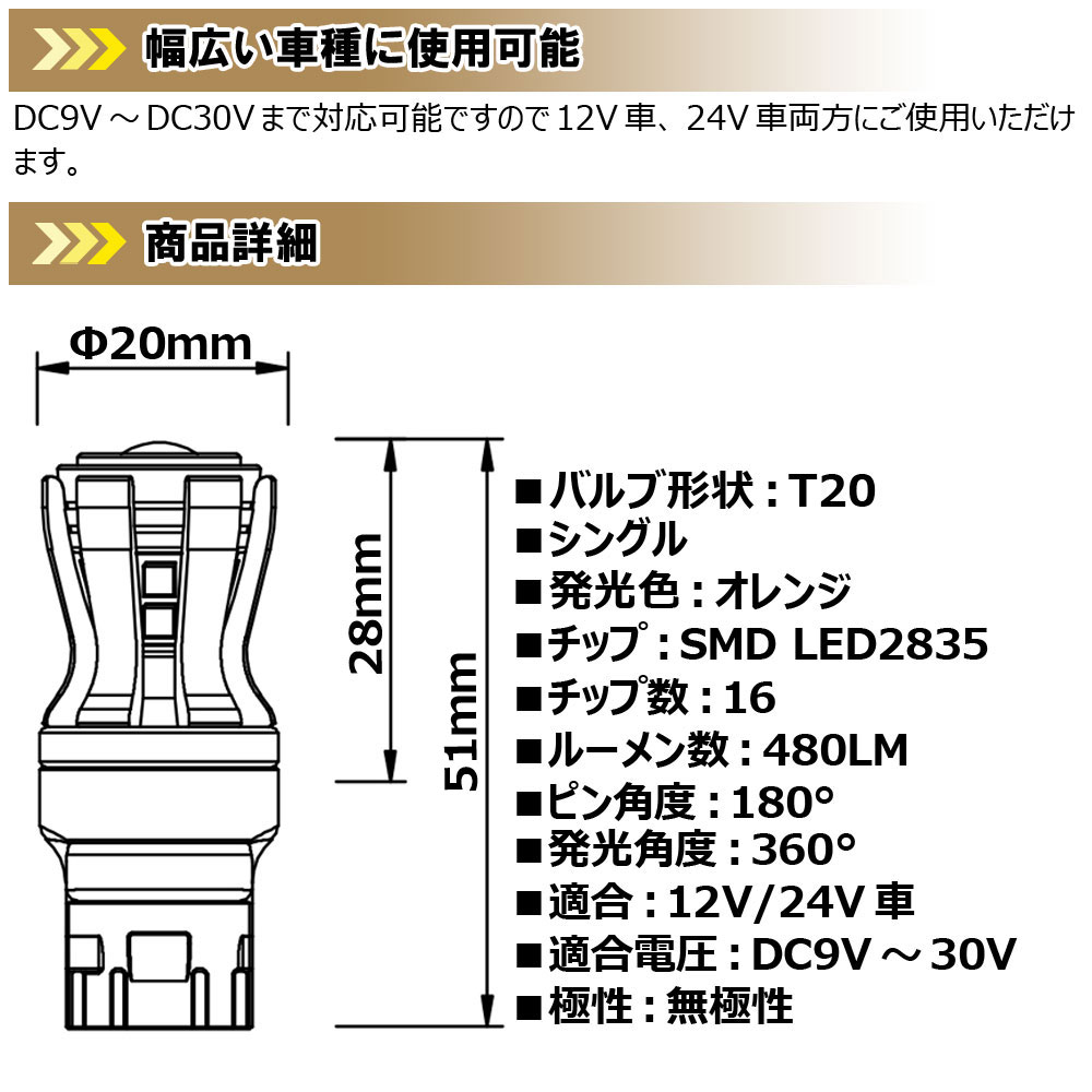 高輝度 LEDバルブ T20 シングル オレンジ アンバー 12V/24V車対応 16チップ 480lm 360°反射型 無極性 2個セット ポジション ウインカー フォグ