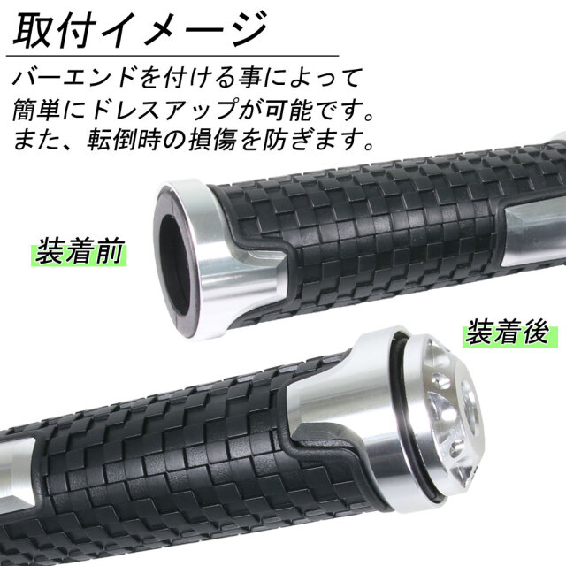 ■アルミ製のグリップエンド2個セットです。 ■ドレスアップしたいけどバーエンドをあまり目立たせたくない方におすすめのカスタムパーツです。 ■バーエンドを付ける事によって転倒時の損傷を防ぎます。 ■エンド部のネジを締める事で取付部のゴムが膨らむので、簡単にお取り付けが出来ます。 ■アルマイト加工がされており、耐腐食性に優れています。 ■5種類のカラーバリエーションがあるので ご自身のバイクグリップにあったカラーをお選びいただけます。 |