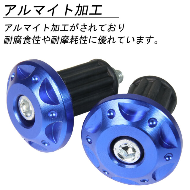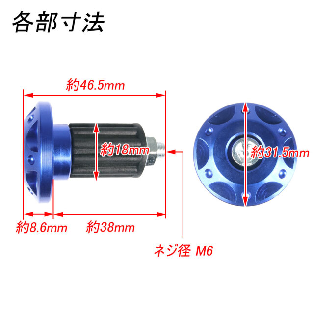 ■カラー:ブルー ■全長:約46.5mm ■取付部直径:約18mm ■エンド部直径:約31.5mm ■ネジ径:M6 ■重量(片側):約32g |